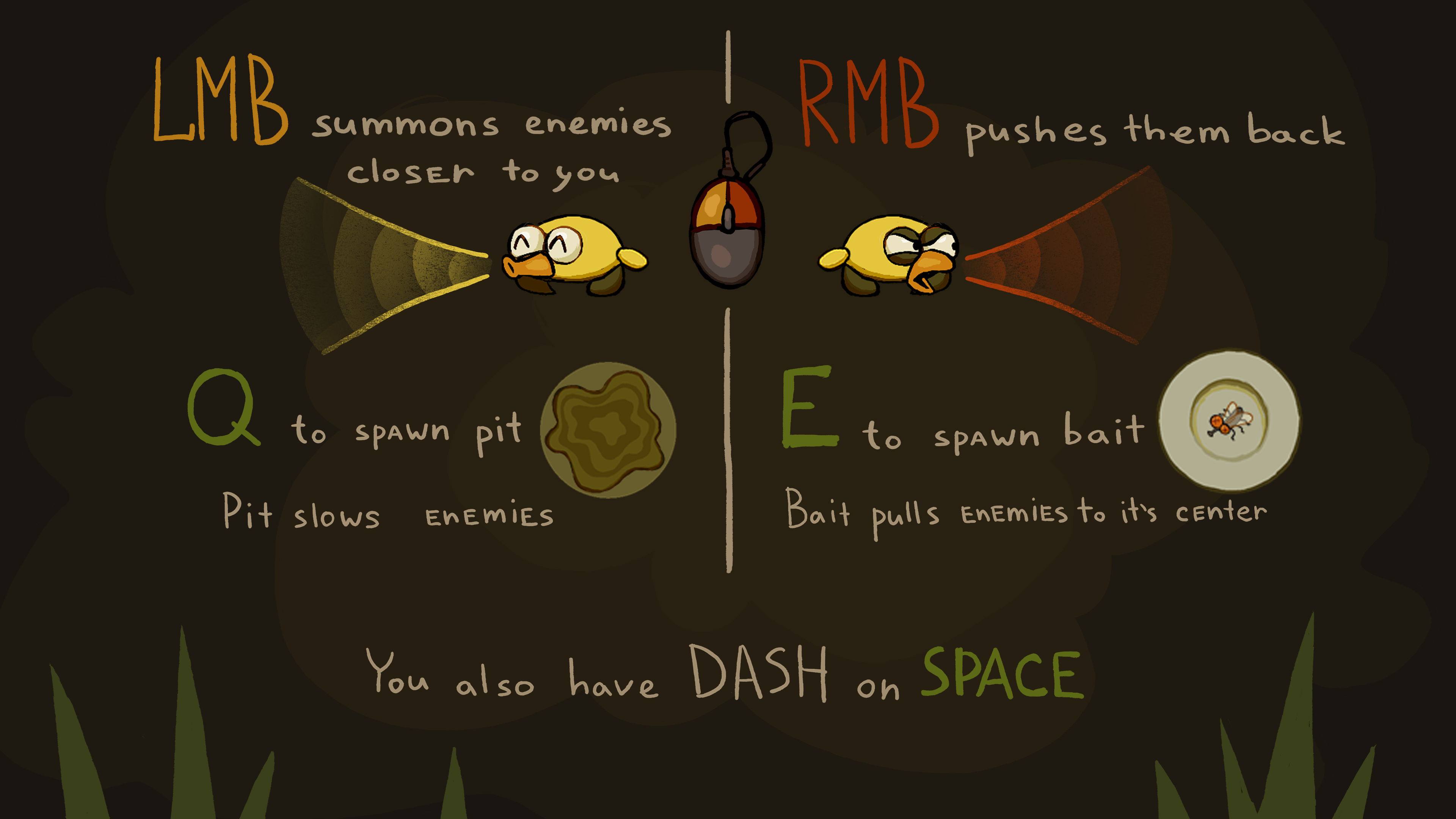 Птенец раскрыл клюв, и призывный сигнал — зов, который манил каждое насекомое в лесу, — разнёсся по чаще. Твоя задача — держать пауков подальше от птенца, пока он не будет готов съесть их!